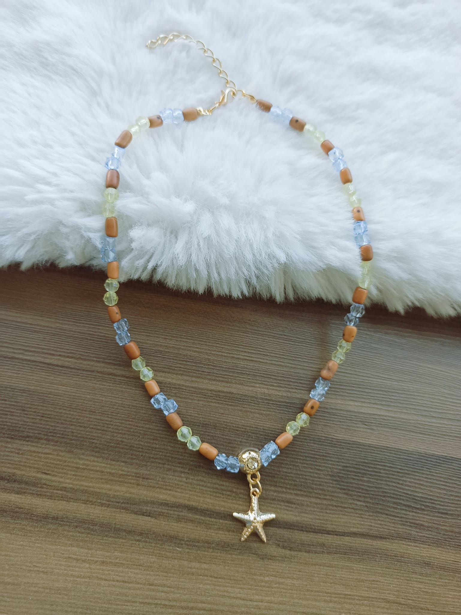 DESCRIÇÃO: Colar choker de sementes de açaí e cristais facetados azuis e amarelos - Pingente estrela do mar e detalhe ponto de luz - Metais dourados - Fecho lagosta - Contém extensor - Os metais são de alta qualidade, com banho em verniz, hipoalergênicos e antiferrugem.